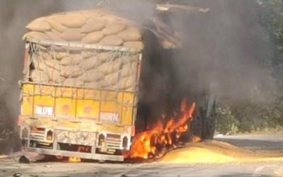 बड़ा हादसा : नेशनल हाईवे पर मक्के से लदे ट्रक में भीषण आग, यातायात ठप…जानें पूरा मामला